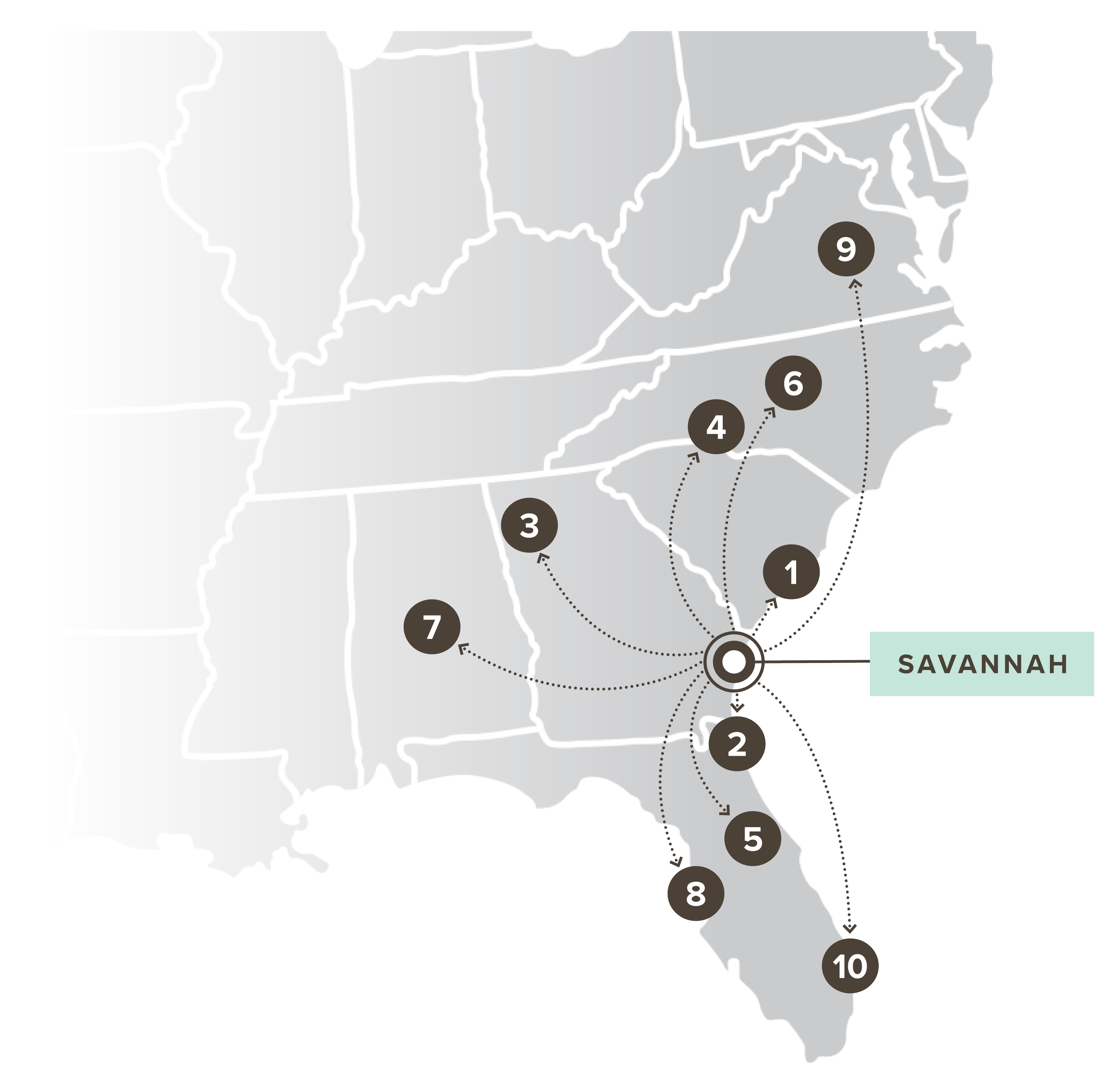 Savannah is primarily a drive-to destination thanks to the area’s connected highway systems (including Interstate 16 and 95) with primary feeder markets including Atlanta, Florida, and North Carolina. Savannah is within 100 miles (2-hour drive) of 2 million people and within 300 miles (6-hour drive) of over 36.8 million people. Due to its highly accessible location, Savannah attracts over 17.3 million visitors annually. Savannah is primarily a leisure-driven lodging market, with over 70% of guests attributable to the transient segment and 89% leisure travel.