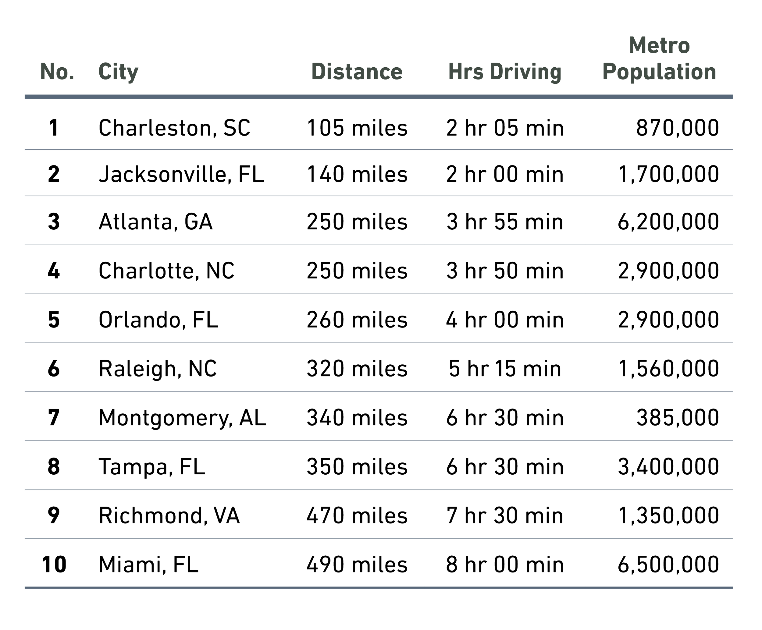 The City’s location off I-95 makes it easily accessible by car and one of the best drive-to destinations in the country. Savannah is within a six-hour drive of approximately 37 million people. More than 17.3 million people visit Savannah each year.